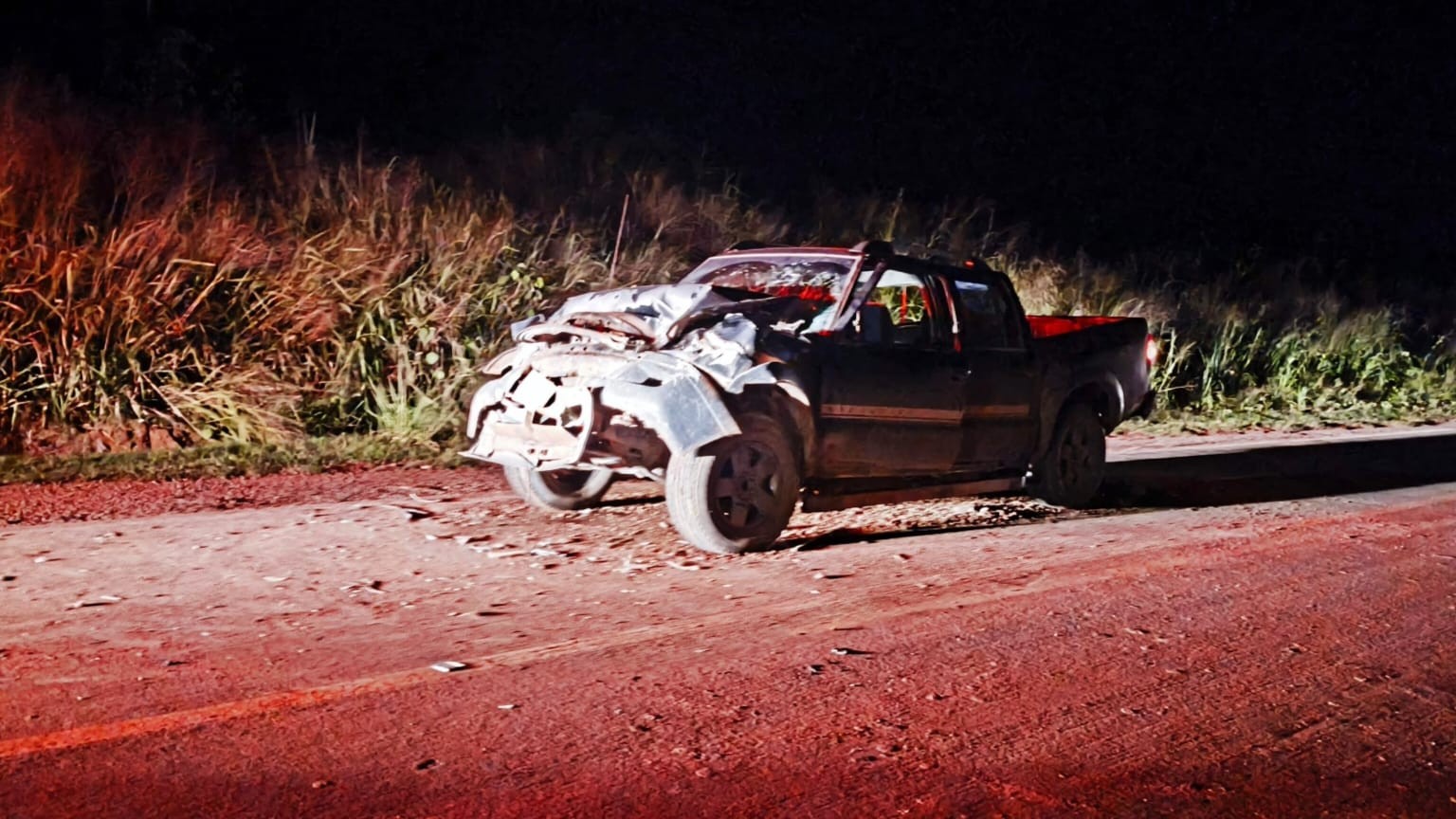 Com o impacto, a parte frontal da caminhonete ficou completamente destruída. O choque foi tão forte que comprometeu até mesmo a estrutura traseira do veículo, que ficou empenada, apesar da colisão ter sido frontal.