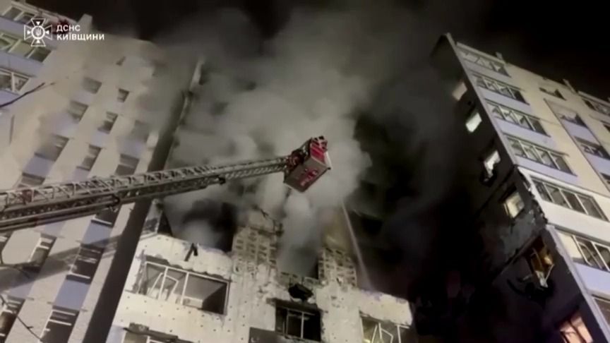 O ataque danificou um prédio residencial de vários andares, oito casas particulares, prédios comerciais e vários carros particulares, disseram autoridades regionais de Kiev.