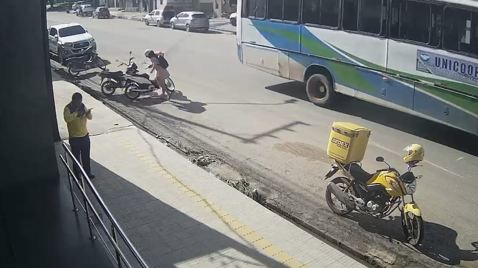 Nas imagens, é possível ver a suspeita se aproximando do veículo. Ela usa um capacete, carrega uma mochila nas costas e segura uma vasilha plástica. Sem demonstrar pressa ou receio, ela despeja o líquido inflamável sobre a motocicleta e, em seguida, risca um fósforo, dando início ao fogo.