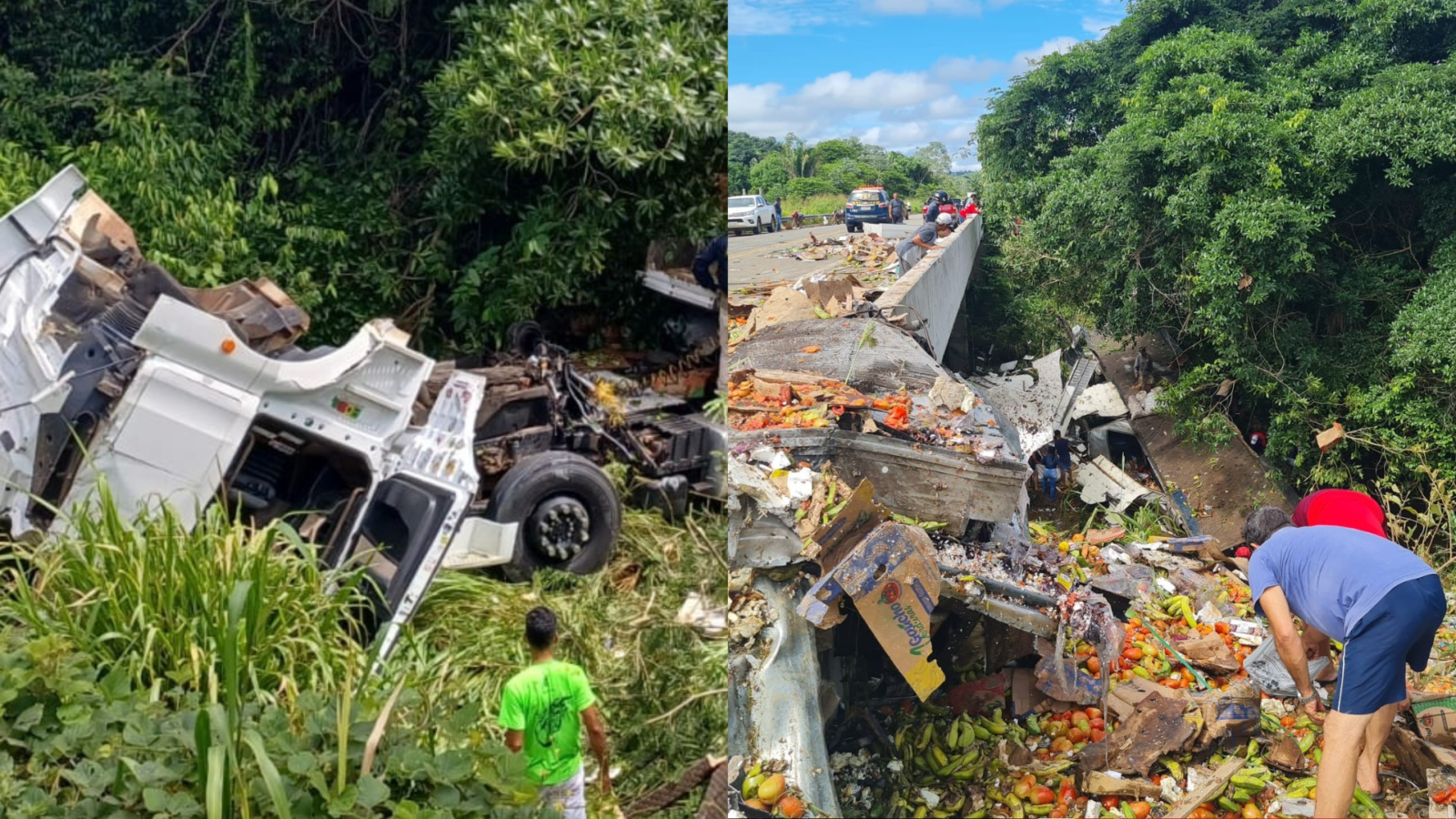 Segundo motoristas que passavam pela área quanto tudo aconteceu, o veículo saiu da rodovia e caiu. Com o impacto, o caminhão ficou completamente destruído, e grande parte da carga, composta por frutas, ficou espalhada pelo chão.