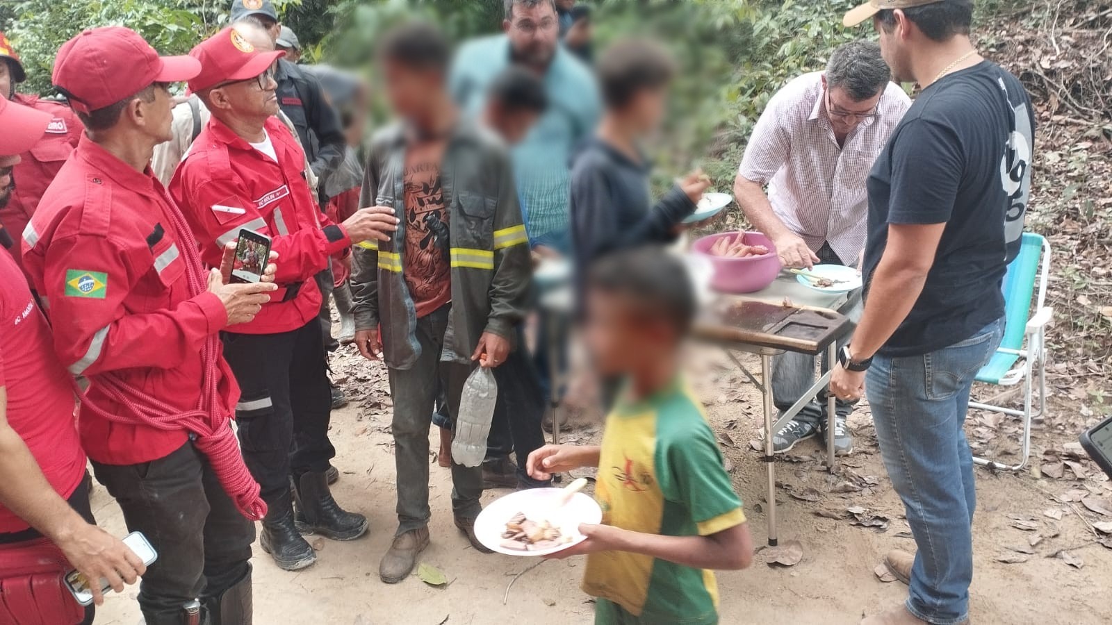 Quatro crianças e um adolescente foram encontrados na manhã desta quarta-feira (15). Eles haviam desaparecido na zona rural de Ipixuna do Pará na segunda-feira (13). Crianças sendo alimentadas após terem sido encontradas na manhã desta quarta-feira (15)