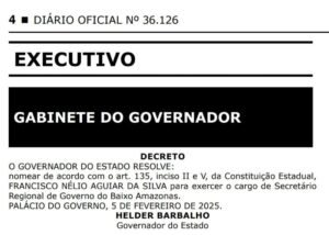 Diário Oficial do Estado desta quinta-feira(6) publica nomeação do ex-prefeito de Santarém para o CRGBA