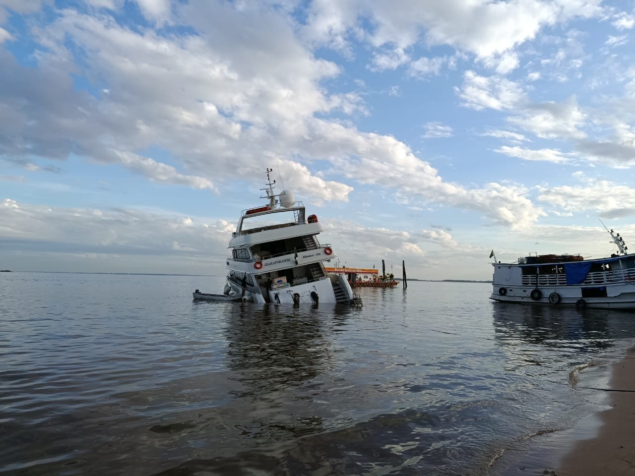 Um iate que estava ancorado em frente à cidade de Santarém, oeste do Pará, tombou para o lado esquerdo no início da manhã desta quarta-feira (6), assustando passageiros que estavam a bordo.