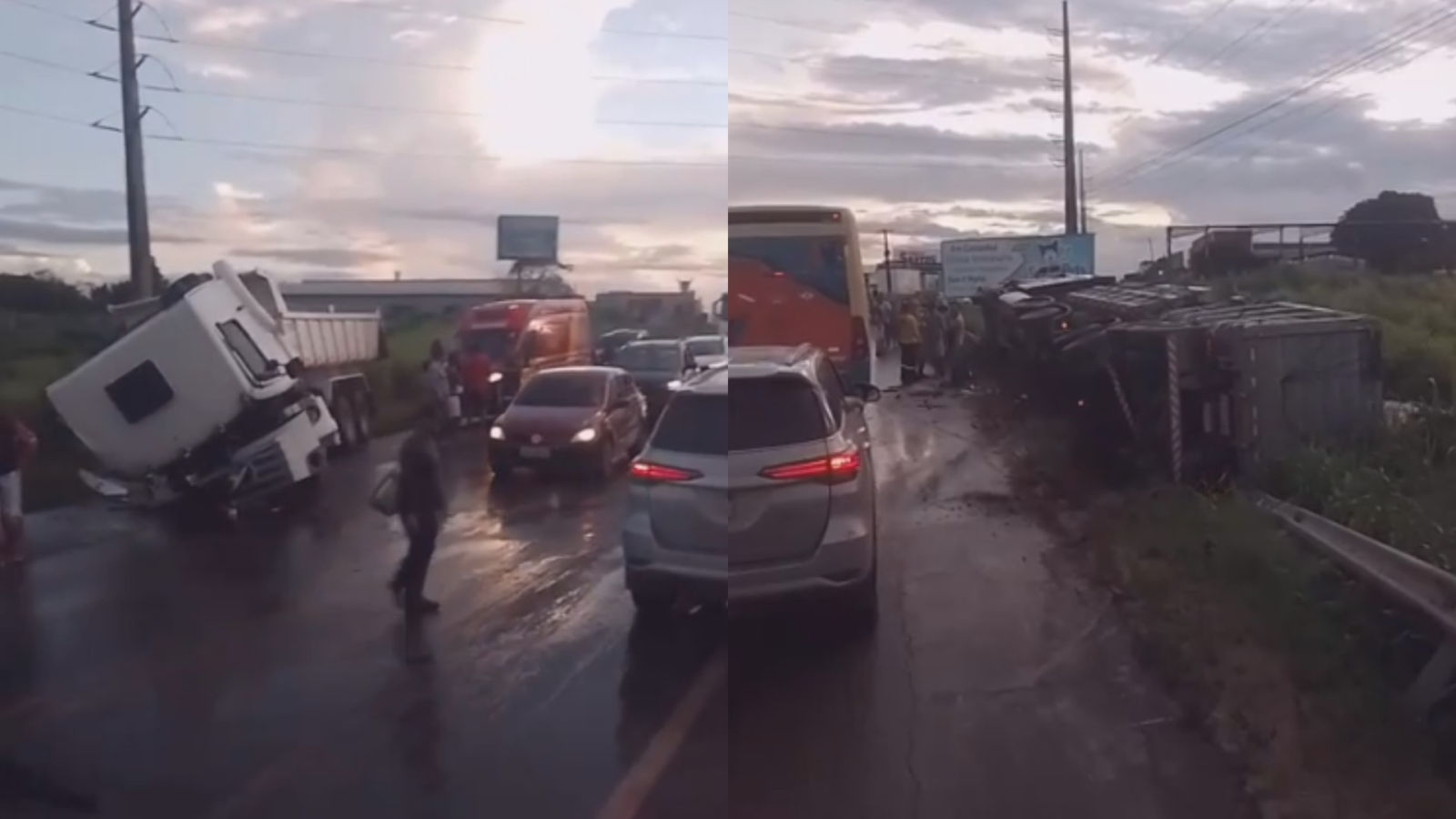 Quem passava pelo trecho no momento do ocorrido disse que um dos veículos realizou uma ultrapassagem em local proibido, o que resultou na colisão com o outro caminhão. Um dos caminhões tombou e o outro teve a parte dianteira tombada.
