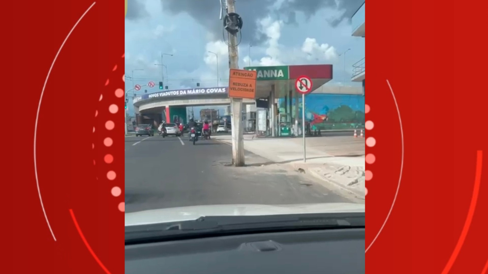 Um vídeo feito por um motorista mostra um poste no asfalto da avenida Mário Covas, no trecho que passou por obras para receber o elevado que conecta a via com a av. Três Corações.
