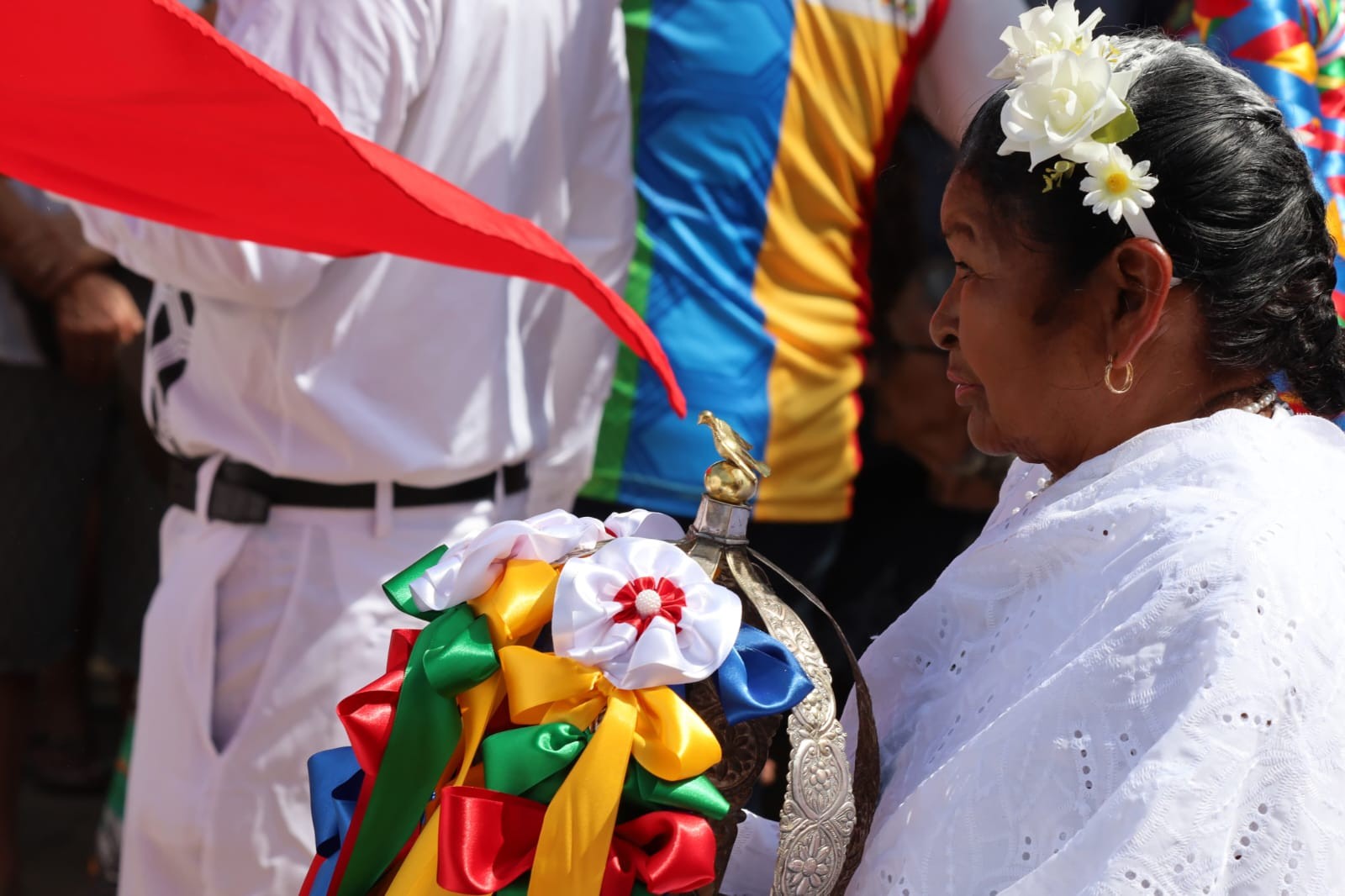 Baena destaca que o Sairé é uma festividade que apresenta símbolos tradicionais compostos por uma narrativa muito plural apresentada em suas telas em cores vibrantes. “Além dos símbolos, há os elementos que fazem parte das celebrações, durante o festejo, um grupo seleto é responsável por um momento de conexão com o rito religioso, que transcende o que os olhos podem ver. Na parte profana, um dos momentos altos da festividade é a disputa entre os botos Tucuxi e Cor de Rosa, fazendo uma celebração importante para a população, que valoriza a história, a tradição e a cultura, mostrando a riqueza da nossa Amazônia Paraense”, observou.