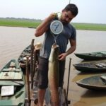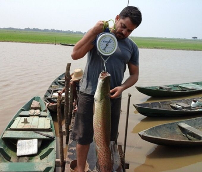 Prof. Fábio Albuquerque durante captura e contenção de exemplar de pirarucu para...
